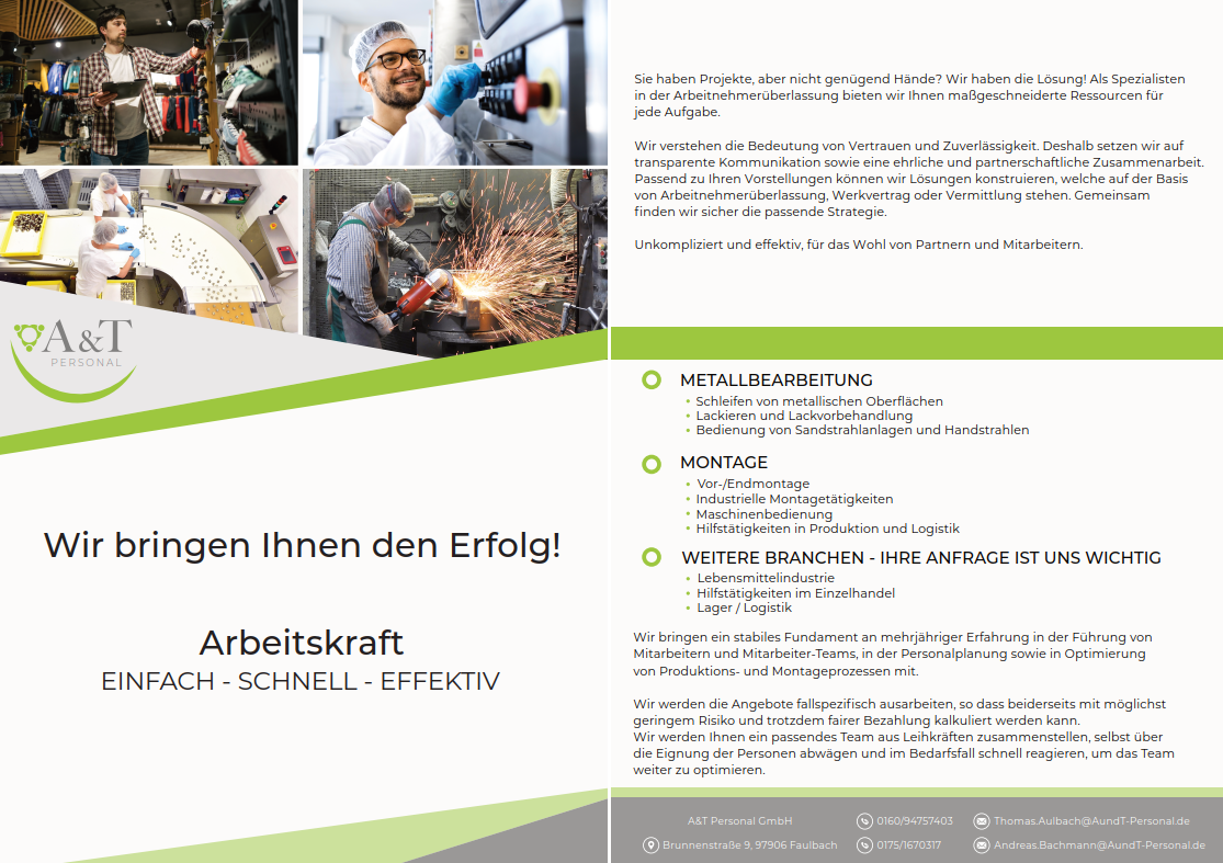 Die A&T Personal GmbH ist Ihr Spezialist für Werkverträge und Arbeitnehmerüberlassung. Wir können Ihnen Fachkräfte mit diversen Qualifikationen – vom Schulabschluss über Facharbeiter bis hin zu Hochschulabsolventen – bedarfsgerecht zur Verfügung stellen. Wir stehen für flexible und maßgeschneiderte Lösungen, die exakt auf Ihre Anforderungen abgestimmt sind.